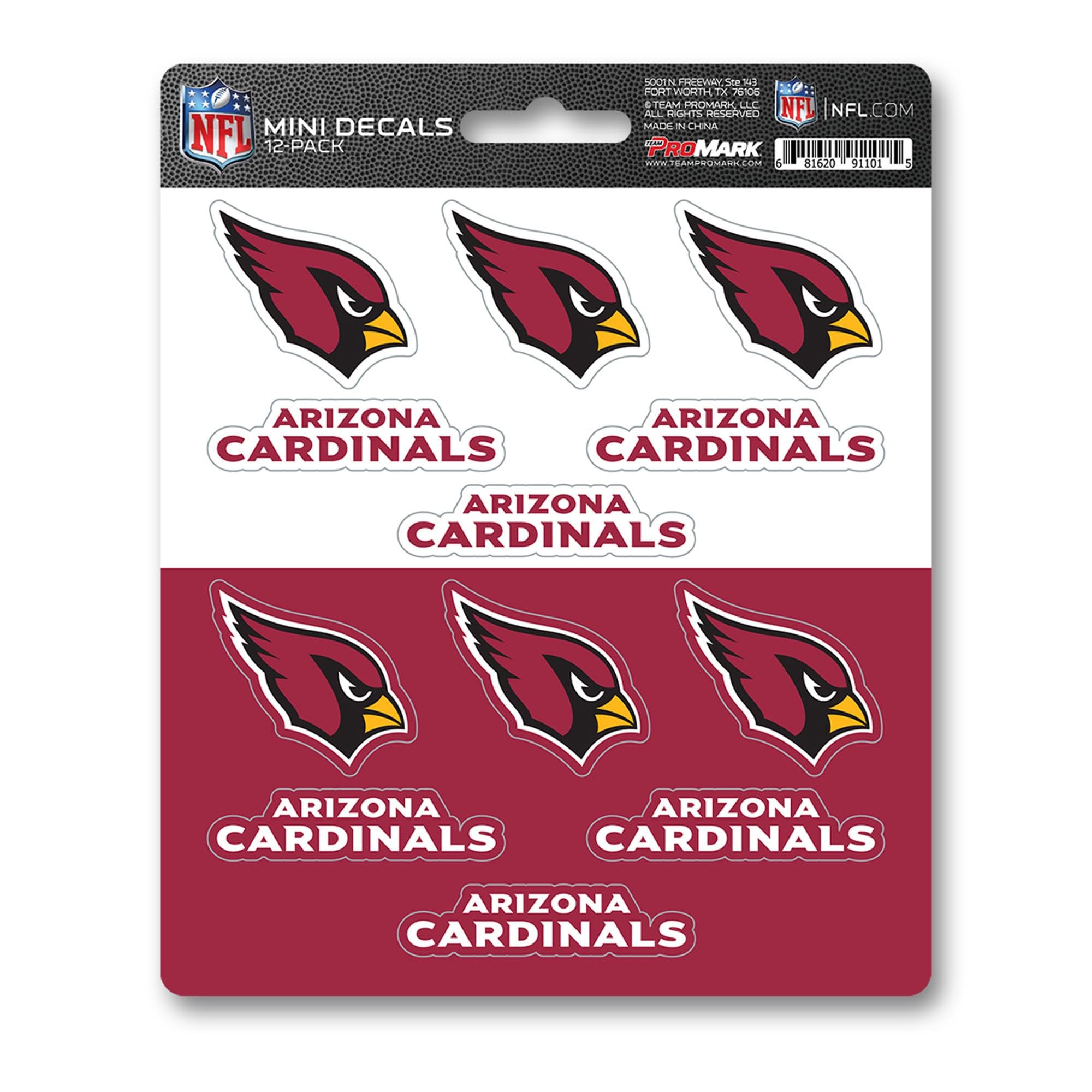 Show your team spirit with this official Arizona Cardinals 12-piece mini decal sticker set. Each sheet contains 12 small 1-inch decals perfect for personalizing your favorite gear and surfaces. Made from premium vinyl with UV-resistant lamination, these die-cut adhesive decals deliver vibrant, long-lasting color. The easy peel-and-stick backing makes application simple on cars, trucks, laptops, coolers, and other hard surfaces. Officially licensed NFL product—the perfect gift for Cardinals fans.Set includes 12 small 1-inch decals on a 5in x 6.25in sheetEasy peel-and-stick backing for effortless application on any surfacePrinted on premium vinyl materialUV resistant with durable color finish that resists fading and weatheringGreat for cars, laptops, coolers and other hard surfacesOfficially licensed NFL Arizona Cardinals productPerfect gift for sports fans, collectors, and team enthusiasts