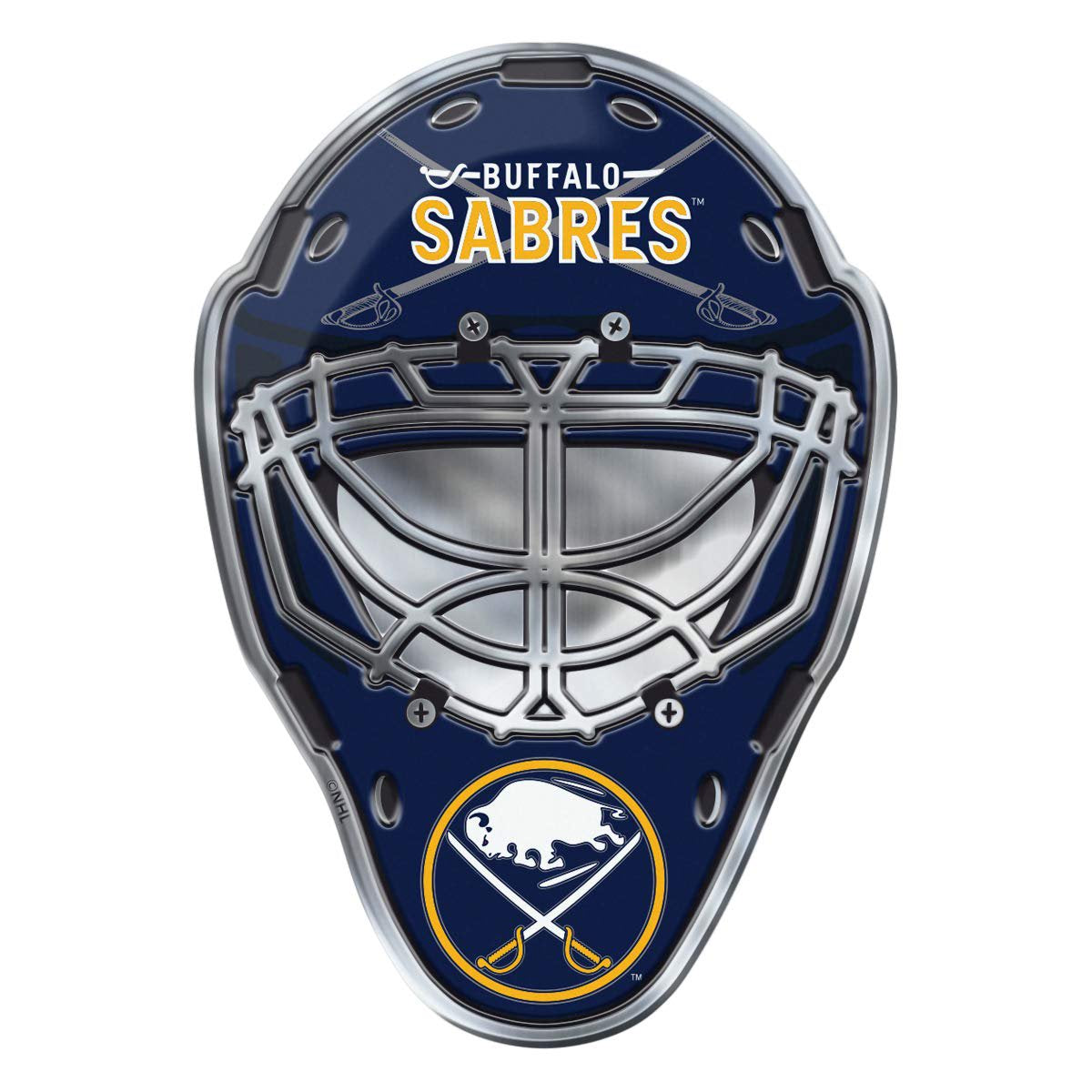 Buffalo Sabres Embossed Color Auto Emblem, Raised Aluminum Metal, Mask Design, 3.5 inch, Full Adhesive Backing, Officially Licensed
