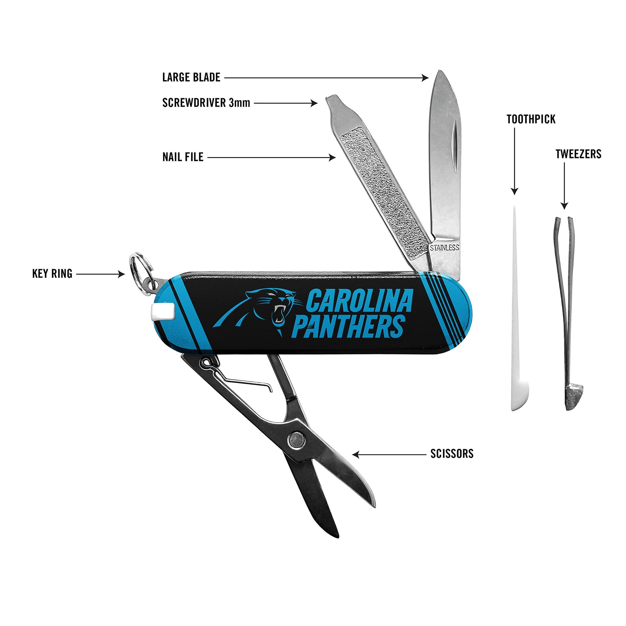 COMPLETE SET: This heavy-duty pocket multi tool set includes a small blade, screwdriver, nail file, scissors, toothpick, tweezers and key ring. The key ring will help keep your keys safe and secure, or you can easily attach to a bag, or backpackPREMIUM STAINLESS STEEL: Constructed of high-quality stainless steel, rust, stain and fingerprint proofOFFICIALLY LICENSED: Features custom team printed artwork which is a great way to showcase your team spirit all year longPORTABLE & LIGHTWEIGHT: Compact size, convenient to have on hand when it's time to work on those DIY projects or to take with you on outdoor camping and fishing trips. Can easily fit in your back pocketGREAT GIFT IDEA: Perfect gift for the loyal sports fan. Makes for an awesome gift for birthdays, anniversaries, Christmas, and other special holidaysPlease select all options.