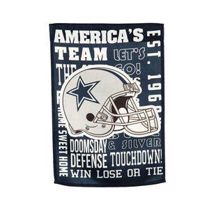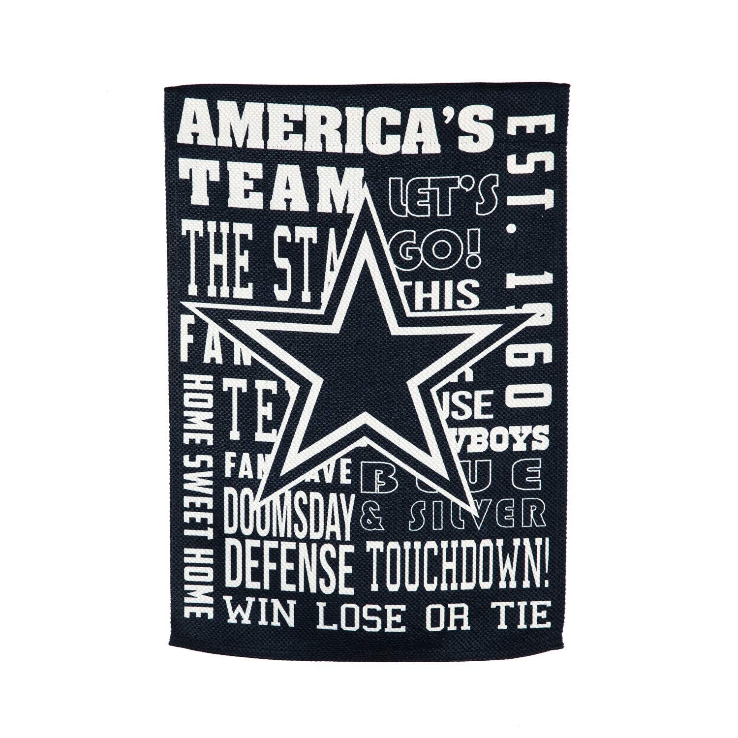 SUPPORT YOUR TEAM IN STYLE: Show your pride loud and proud with this gorgeous double sided garden flag. Dallas Cowboys fans will enjoy a dark blue and silver flag with the Cowboys logo embossed in the center with different designs on both sides of the flag. Various team phrases like Doomsday Defense, America's Team, Est. 1960, and Win Lose or Tie accent the flag and display your team spirit for everyone to see.THE PERFECT FIT: Measures approximately 13 x 18 inches, making it just the right size for standard flag stands, sold separately. This festive flag is the perfect addition to your indoor or outdoor décor or the ideal gift for a sports fanatic!QUALITY THAT LASTS: Crafted from weather-resistant and outdoor-safe materials, this flag will withstand all outdoor elements and seasons. You can enjoy your garden with the confidence that this flag will last from playoffs to championships for years to come.FILL YOUR FAN CAVE: Your fan cave isn't complete without sports merchandise from your favorite NFL, NHL, NBA, MLB and college teams crafted by Team Sports America! Click on the Team Sports America Link under product name to shop our full catalog.Please select all options.