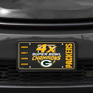 Green Bay Packers 4-Time Champions Premium Metal Tag License Plate, Carbon Fiber Design, 12x6 inch, Pre-Drilled Holes, Officially Licensed