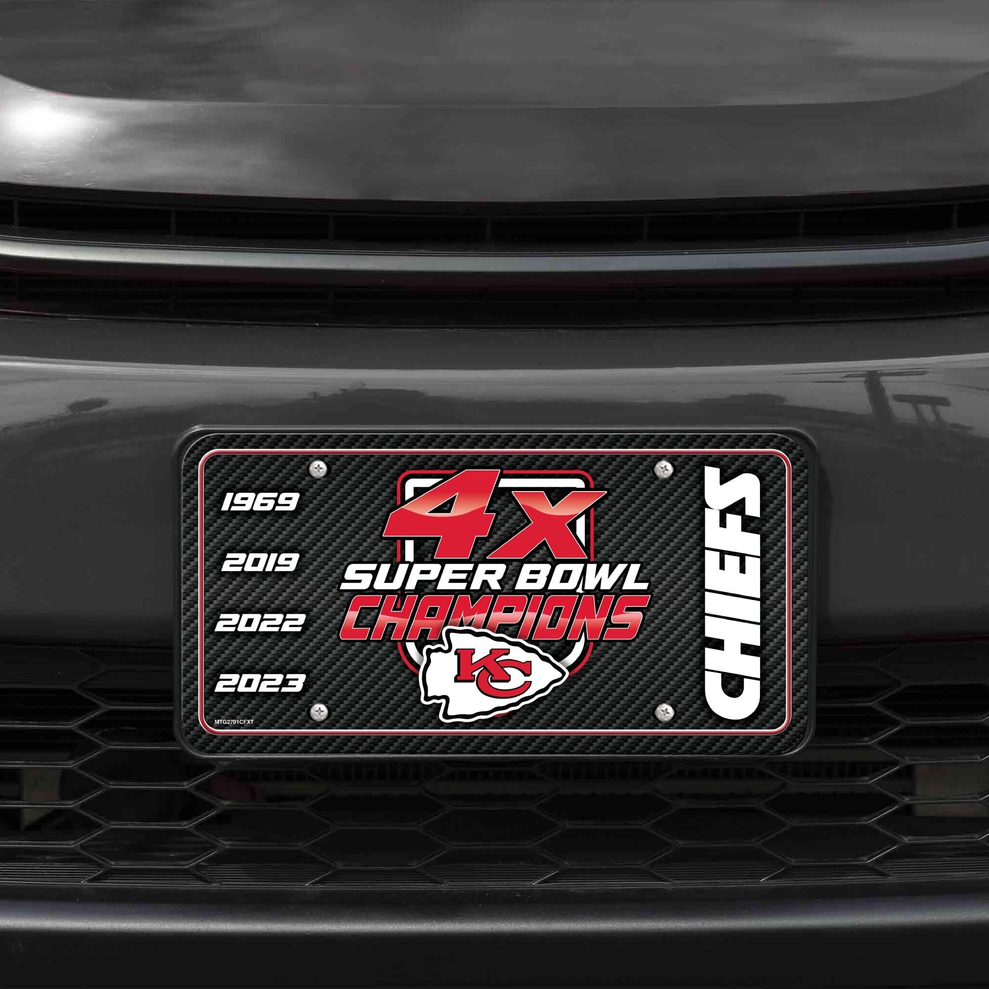 Kansas City Chiefs 4-Time Champions Premium Metal Tag License Plate, Carbon Fiber Design, 12x6 inch, Pre-Drilled Holes, Officially Licensed