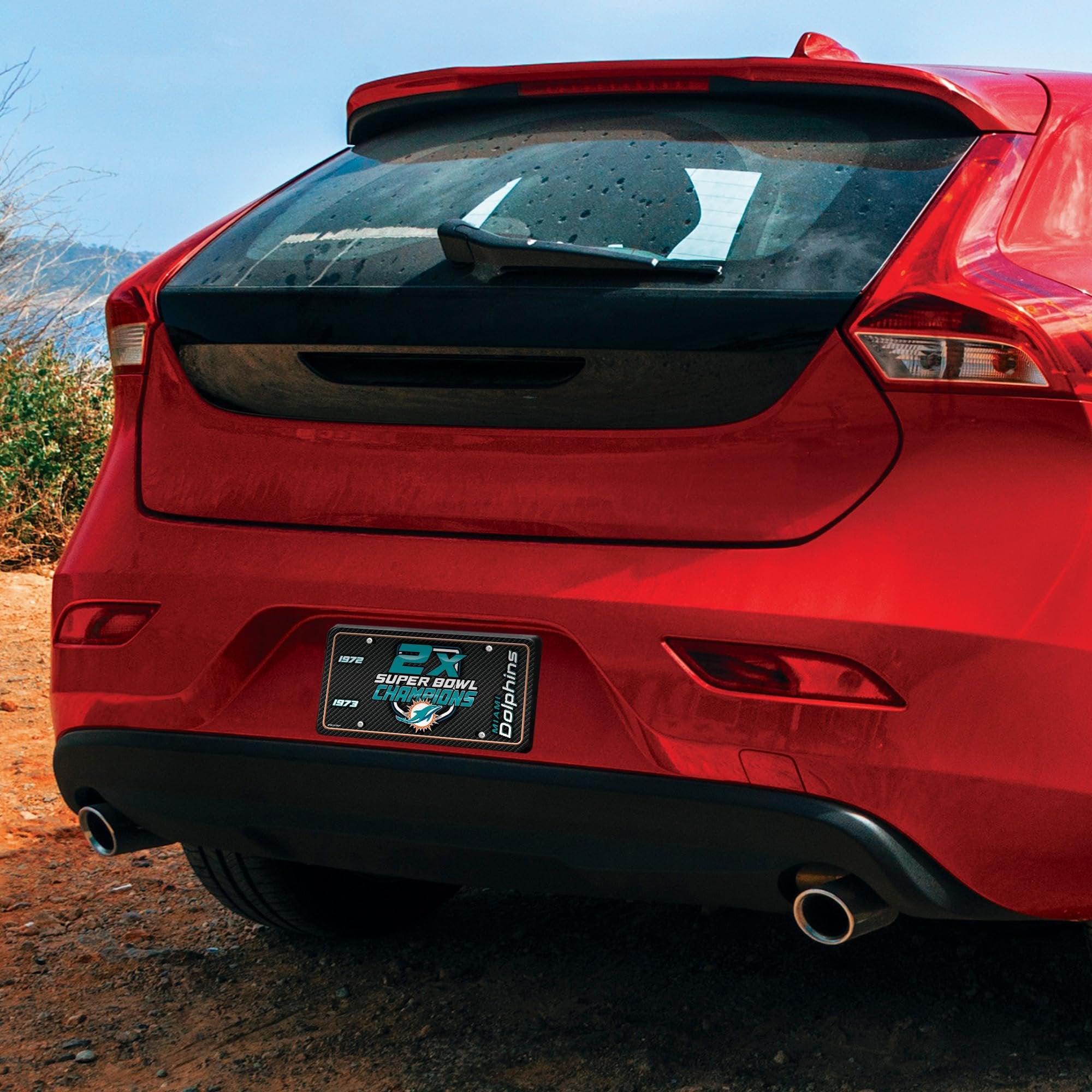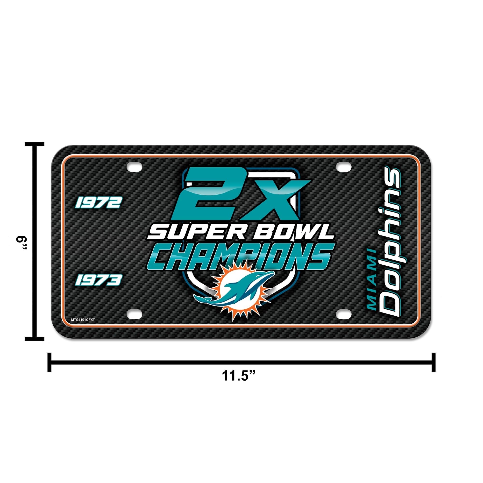 Miami Dolphins Multi Champ Carbon Fiber Design Metal Auto Tag 6" x 12" A great gift idea for Miami Dolphins football fans that is guaranteed to be a beloved possession with eye catching graphics. Durable and fade resistant, the 12" x 6" automobile tag is expertly made, using quality aluminum which ensures it can survive the different season and extreme weather. This auto accessory is perfect for the casual and everyday fan. Whether it is game day at the stadium or a home game with friends this auto tag will be the highlight of the drive. This tag can be used on the front or back or your car, truck, or RV. It can also be used on your trailer. Has predrilled screw holes to easily attach onto your automobile. Hassle free!Great Gift Item for NFL Football Fans: Guaranteed to be your most beloved possession as it boasts eye catching graphics and is inscribed with your favorite squad’s name and colors. Proudly display your favorite teams name and colorA One-Of-A-Kind Tag – Be the first to own an exceptionally durable, fade resistant 12" x 6" automobile tag. Expertly made, using quality aluminum which ensures your tag can survive the different season and extreme weather.A Fan Favorite 12" x 6" Car/Truck Tag - This auto accessory is perfect for the casual and everyday fan. Whether it is game day at the stadium or a home game with friends this auto tag will be the highlight of the drive.High Performance & Versatile: This brand-new accessory tag can be used on the front or back or your car, truck, or RV. It can also be used on your trailer. Has predrilled screw holes to easily attach onto your automobile. Hassle free!Bring Your Room Car To Life With This Officially Licensed Car/Truck Tag - A limited edition collectible that will be talked about forever whether you are a casual, social, or super fanatic fan. All your friends will be asking you where you got your auto Tag!