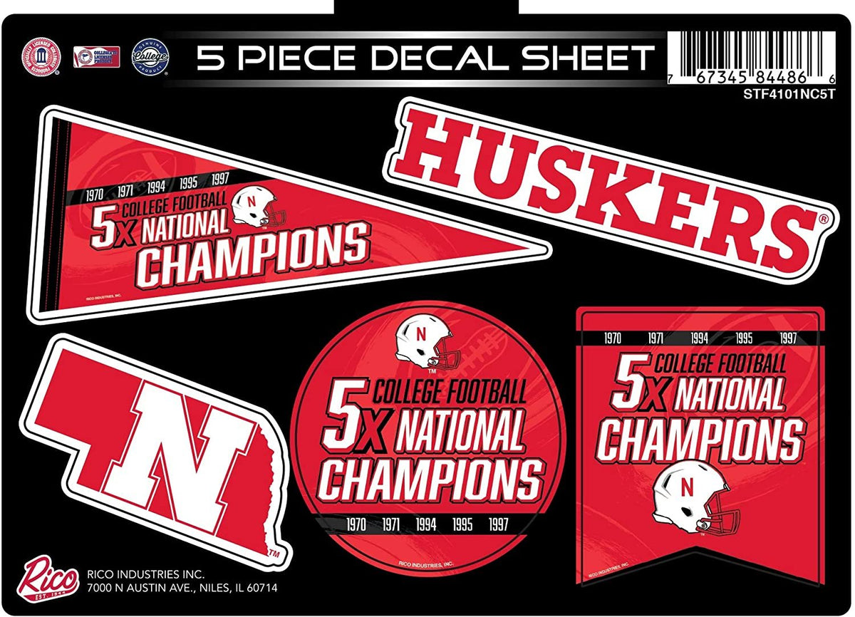 Nebraska Cornhuskers 5X Time Champions Decal Sticker Multi Sheet 5 Piece College Football Flat Vinyl Emblem University of