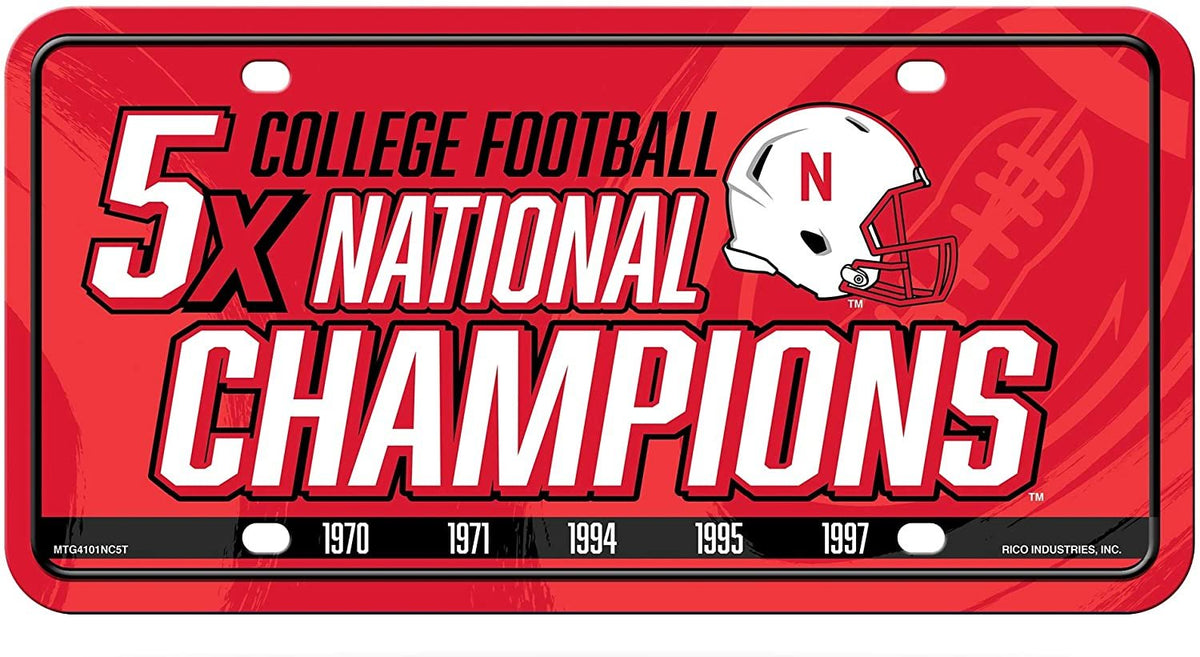 University of Nebraska Cornhuskers Metal Auto Tag License Plate, 5-Time Champions, 6x12 Inch