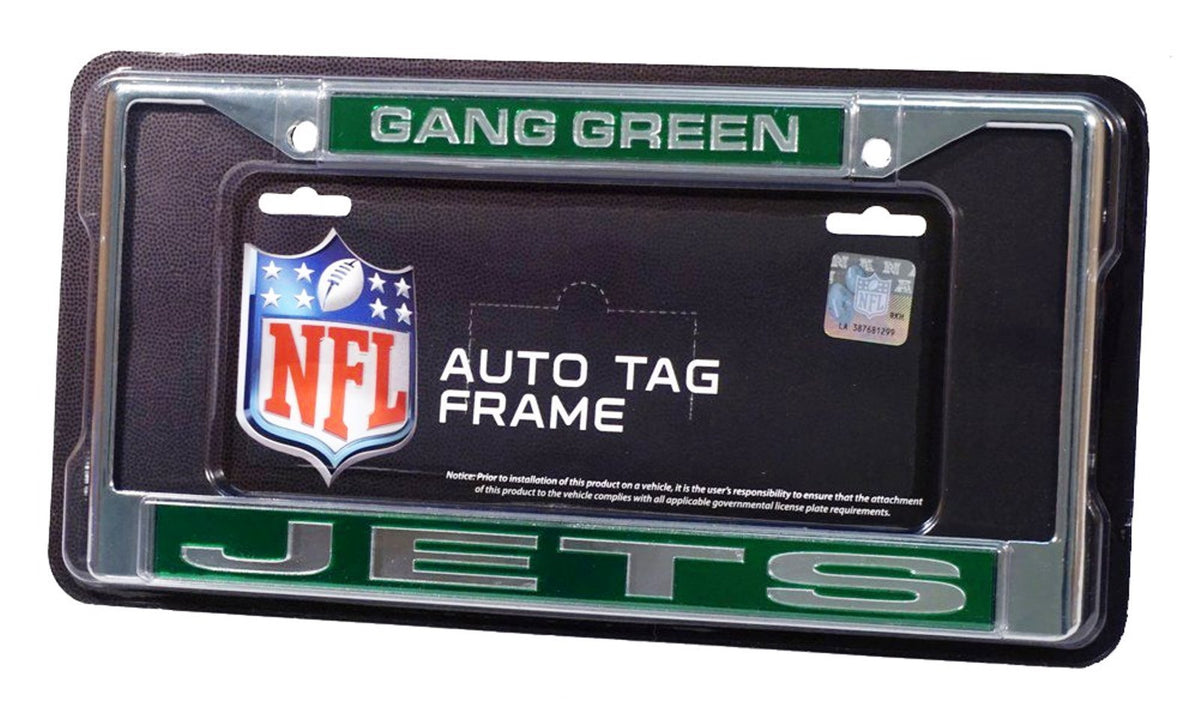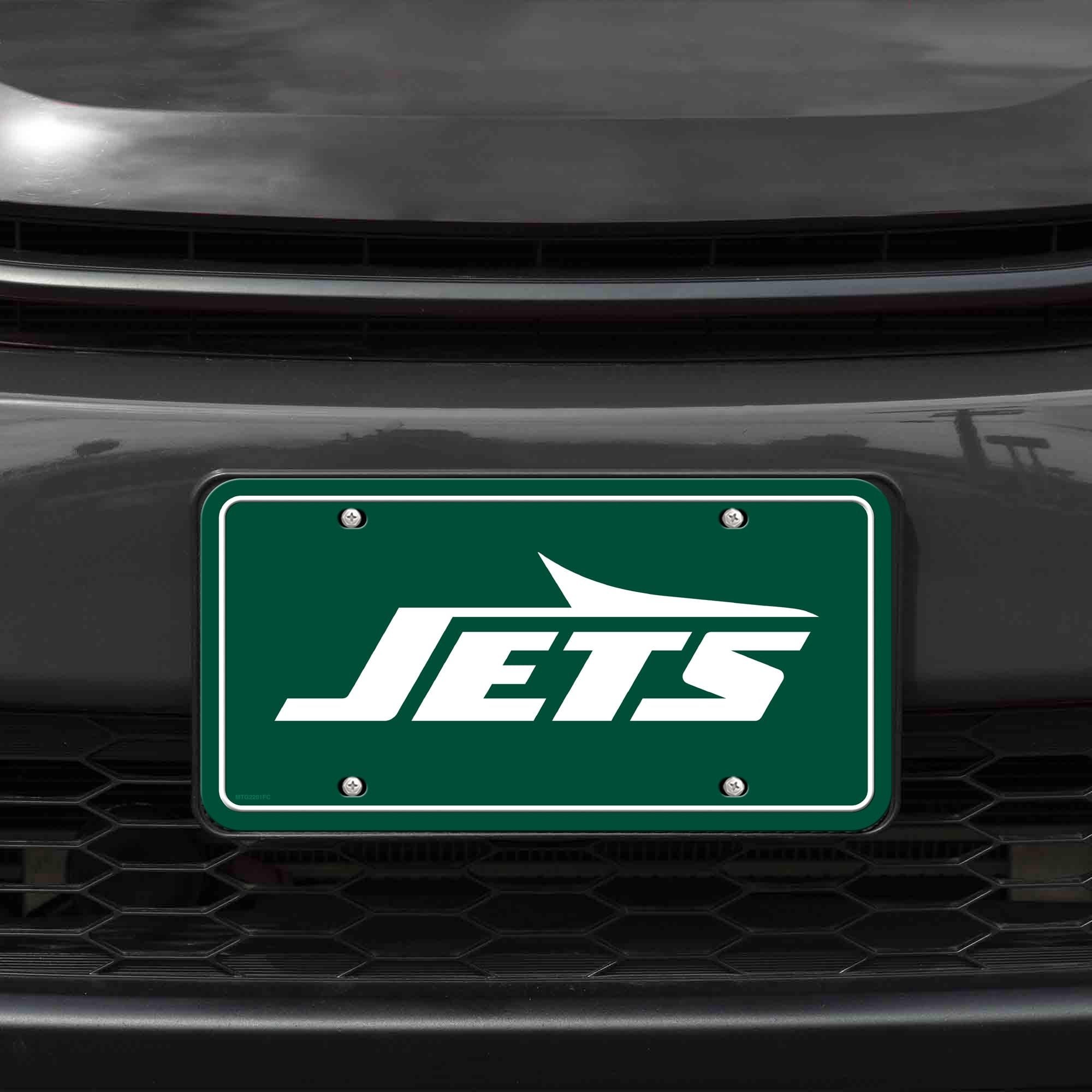 New York Jets Metal License Plate Frame Chrome Tag Cover, Gang Green Design, Laser Acrylic Inserts, 12x6 Inch, Pre-Drilled Holes, Officially Licensed