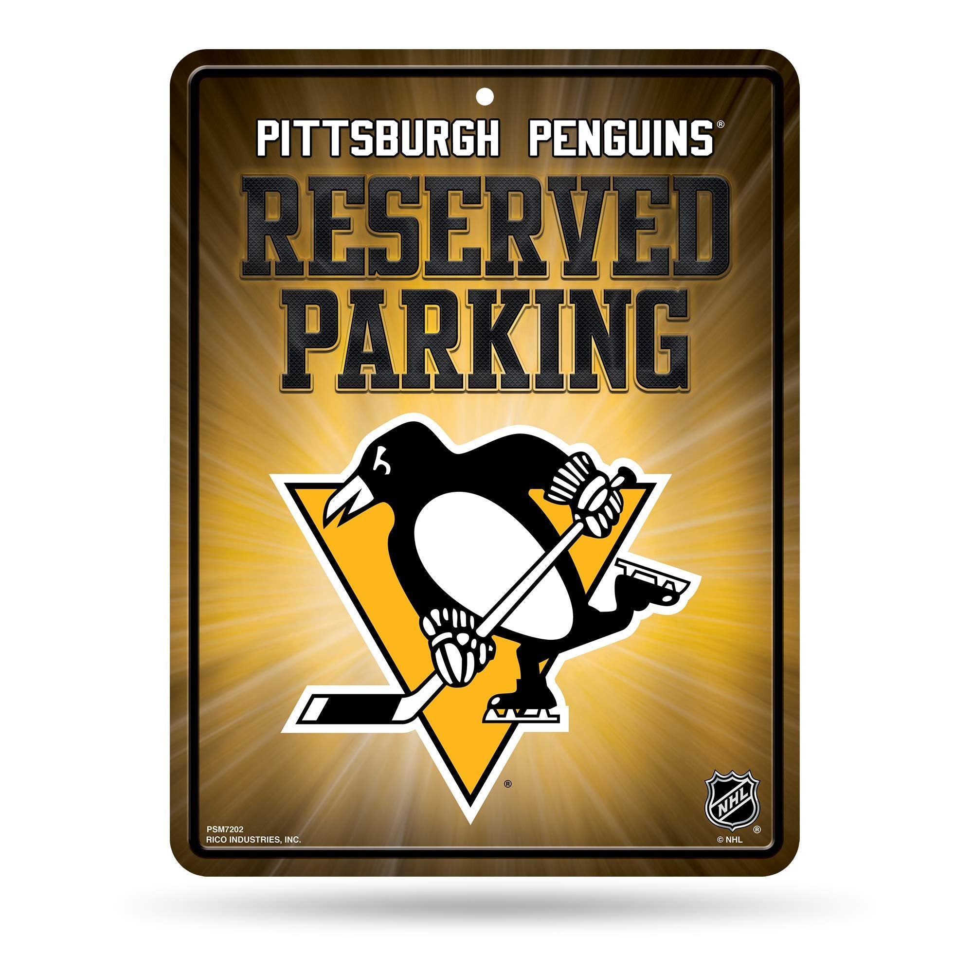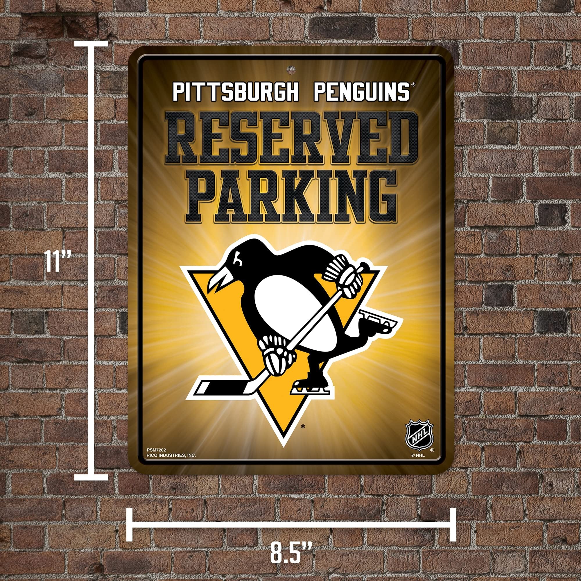 Rico Industries NHL Pittsburgh Penguins 8.5-Inch by 11-Inch Metal Parking Sign DécorMetal Parking Sign Measures 8.5-inches by 11-inchesFeatures 4-Color Process Printing in Team Colored Graphics, Creates Dynamic and Bold StatementConstructed of High Quality Embossed AluminumFeatures Pre-Drilled Holes for Easy InstallationOfficially Licensed, Made in the USAThe 8.5-Inch by 11-Inch Metal Parking Sign Décor by Rico Industries is the ultimate showcase of your team pride both as a decoration in the home or office, and when it comes to marking which parking spot is yours. It measures 8.5-inches by 11-inches and is decorated with vibrant team colored graphics that everyone is sure to notice. Made from embossed aluminum this sign features a pre-drilled hole for easy wall hanging.Measures 8.5-inches-by-11-inches