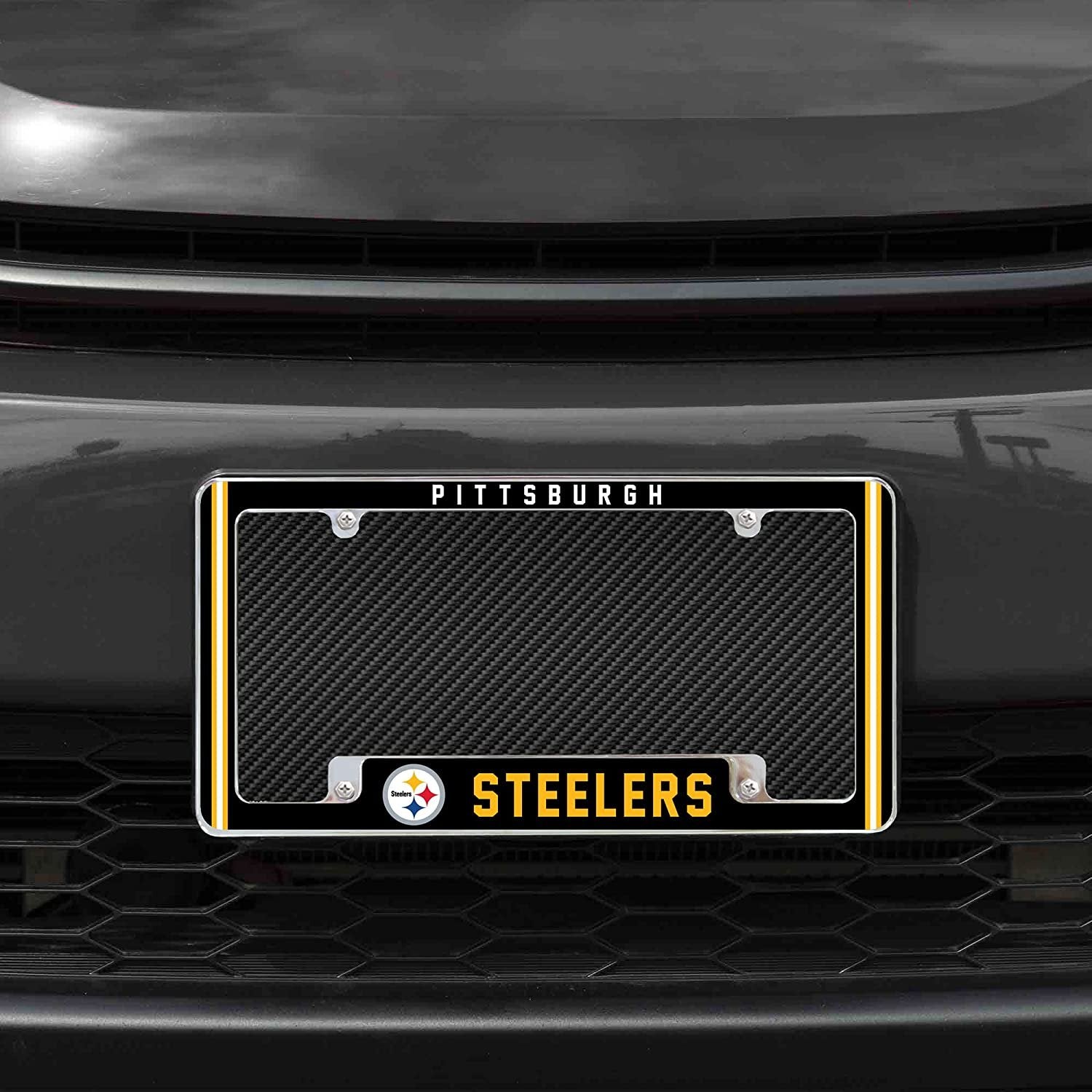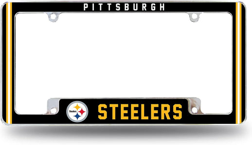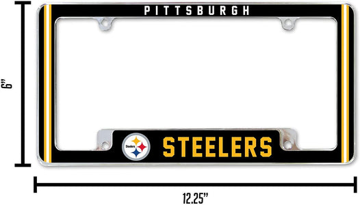 Rico Industries NFL Pittsburgh Steelers Alternate 12" x 6" Chrome All Over Automotive License Plate Frame for Car/Truck/SUVColorful bold design of your favorite team displayed all over the frameAll corner view makes it legal in most statesMeasures approximately 12x6 inches - fits most vehiclesFour pre-drilled holes (if necessary) for mounting - hardware not included