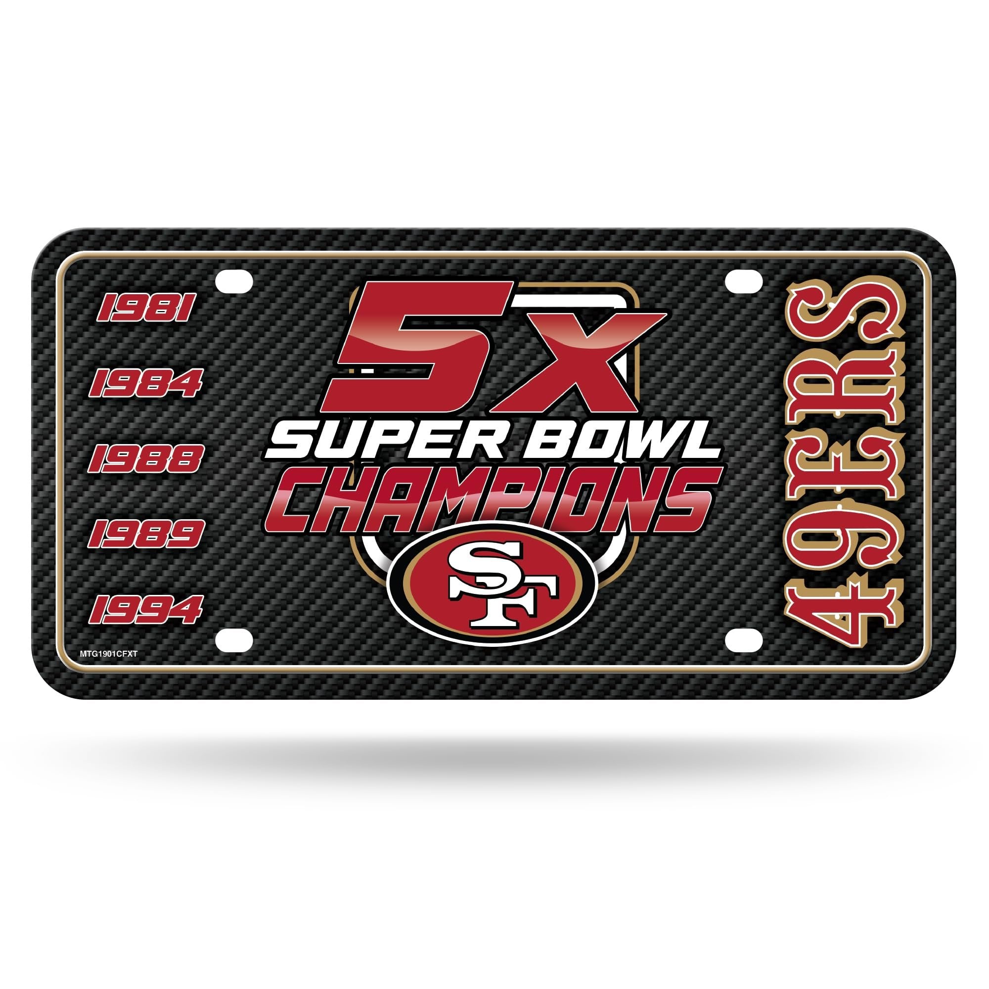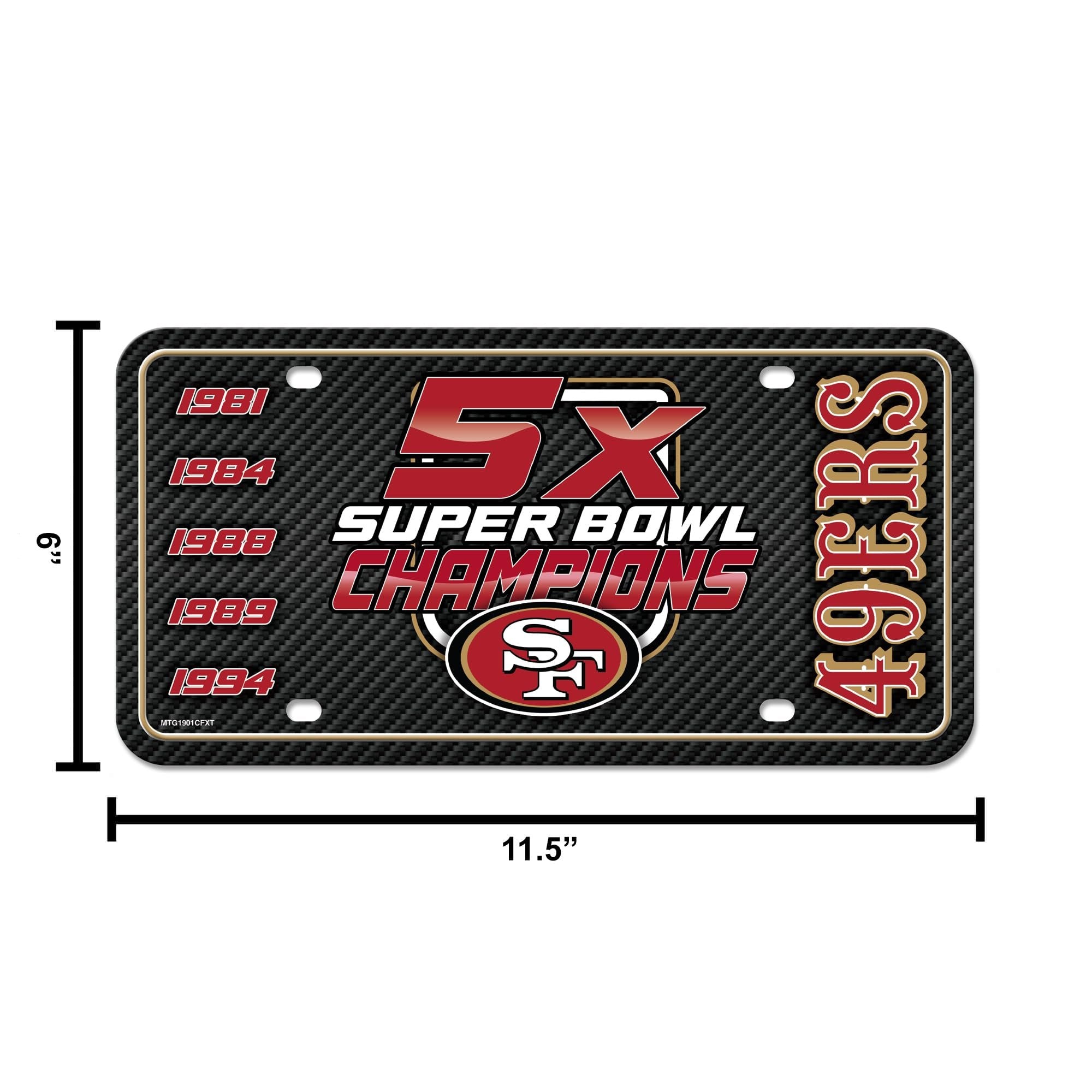 San Francisco 49ers Multi Champ Carbon Fiber Design Metal Auto Tag 6" x 12" A great gift idea for San Francisco 49ers football fans that is guaranteed to be a beloved possession with eye catching graphics. Durable and fade resistant, the 12" x 6" automobile tag is expertly made, using quality aluminum which ensures it can survive the different season and extreme weather. This auto accessory is perfect for the casual and everyday fan. Whether it is game day at the stadium or a home game with friends this auto tag will be the highlight of the drive. This tag can be used on the front or back or your car, truck, or RV. It can also be used on your trailer. Has predrilled screw holes to easily attach onto your automobile. Hassle free!Great Gift Item for NFL Football Fans: Guaranteed to be your most beloved possession as it boasts eye catching graphics and is inscribed with your favorite squad’s name and colors. Proudly display your favorite teams name and colorA One-Of-A-Kind Tag – Be the first to own an exceptionally durable, fade resistant 12" x 6" automobile tag. Expertly made, using quality aluminum which ensures your tag can survive the different season and extreme weather.A Fan Favorite 12" x 6" Car/Truck Tag - This auto accessory is perfect for the casual and everyday fan. Whether it is game day at the stadium or a home game with friends this auto tag will be the highlight of the drive.High Performance & Versatile: This brand-new accessory tag can be used on the front or back or your car, truck, or RV. It can also be used on your trailer. Has predrilled screw holes to easily attach onto your automobile. Hassle free!Bring Your Room Car To Life With This Officially Licensed Car/Truck Tag - A limited edition collectible that will be talked about forever whether you are a casual, social, or super fanatic fan. All your friends will be asking you where you got your auto Tag!