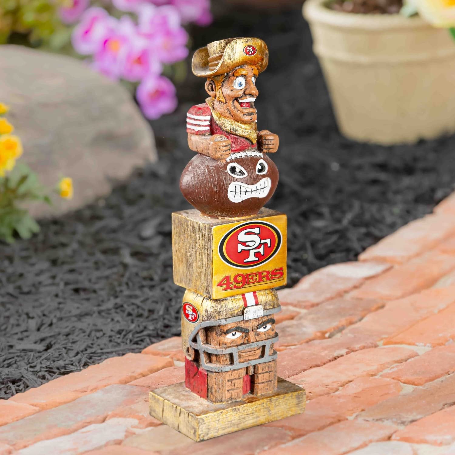 Evergreen Enterprises NFL San Francisco 49ers Tiki Totem16 Inch Tiki Totem Garden Statue, Sculpted from Polystone resinHand painted and features detailed wood-carving Designs and logo decal applicationTiki Totem Garden Statue, Hand Painted Resin, Indoor Outdoor Decor, Officially LicensedPerfect for the garden, table top, a tailgate, or your man cave, the statue is outdoor safe for season-round enjoymentMeasures approximately 16 x 4.4 x 3 inchesDecorate Your Home or Yard with this Fun Tiki Totem!