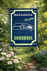 Show your Seattle Seahawks pride with this premium double-sided garden flag banner! Featuring the iconic Seahawks logo and established date of 1976, this flag combines classic team styling with modern design elements including glitter accents and a crisp navy blue background with eye-catching neon green trim. The 13x18 inch size is perfect for garden display, while the durable polyester construction stands up to outdoor conditions. The rectangular flag includes elegant suede-like texture and displays beautifully on a garden pole (not included). The official NFL licensed design showcases 'FOOTBALL' in bold lettering and includes the distinctive Seahawks logo repeated in each corner. Perfect for game days, sports seasons, or year-round team spirit display. The double-sided design ensures your team pride is visible from any angle in your garden or yard. Machine washable for easy care, this flag brings professional sports atmosphere to your outdoor space with its premium quality craftsmanship and attention to detail.